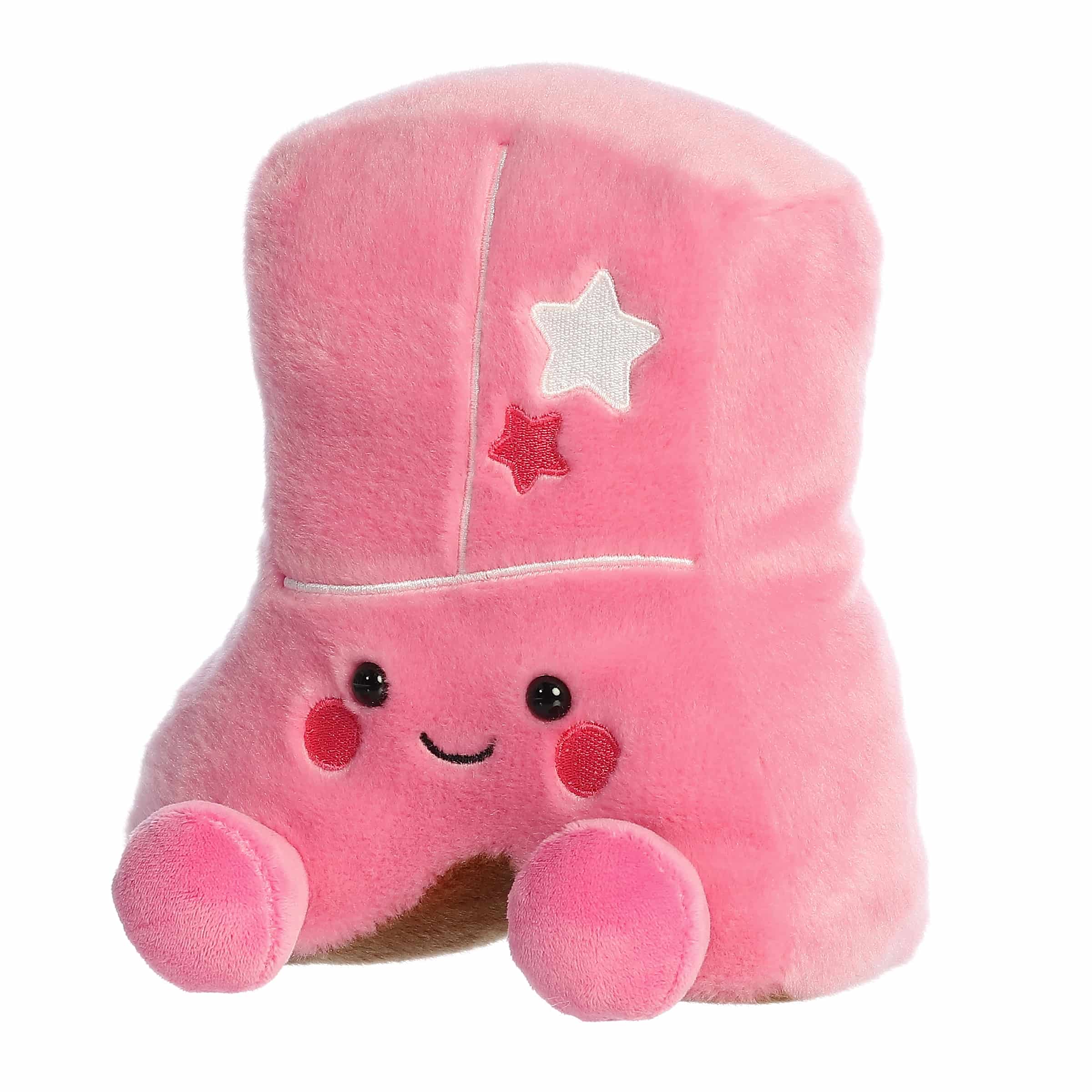 Meet Kate, the Party-Sized Palm Pal Cowgirl Boot, the star-studded sweetheart of the wild west! With a bright pink plush body, embroidered white and red stars, and rosy cheeks, Kate is always ready to steal the spotlight-whether it’s on the dance floor or the prairie.
