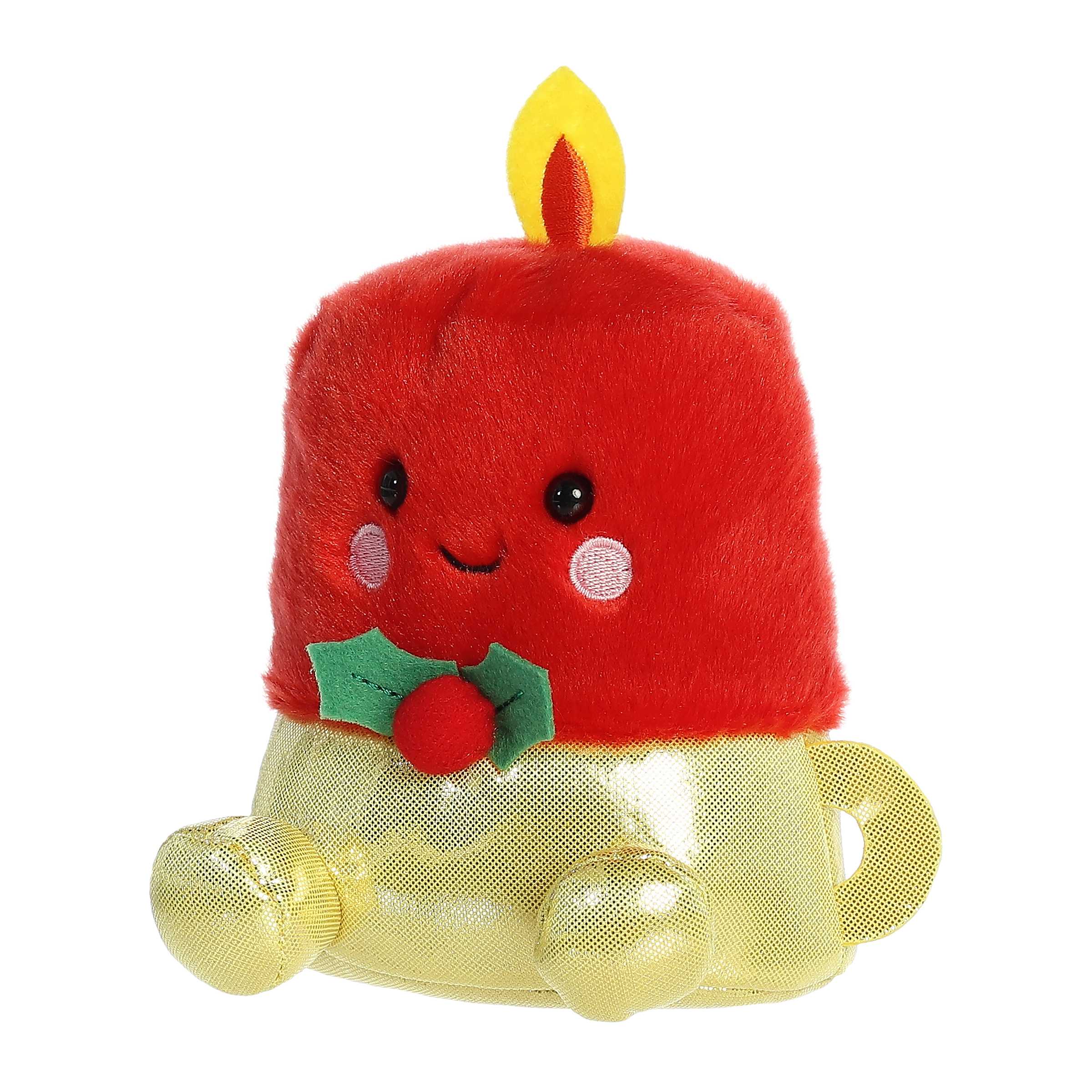 Luz Candle is a vibrant red plush, wearing a golden candle holder around his base with a cheerful flame atop his head.
